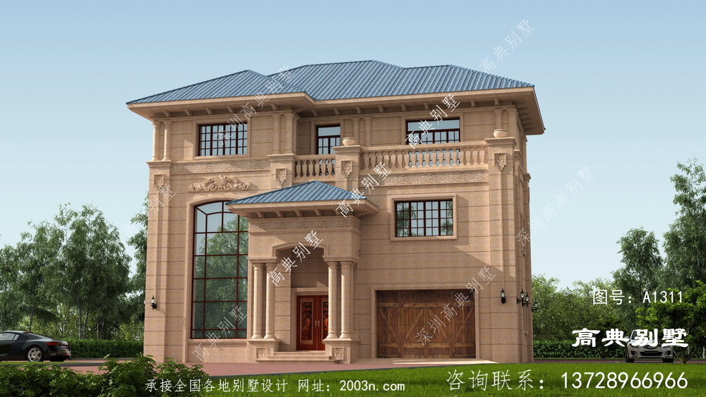这座三层欧式石材别墅采用复式挑空客厅设计,外观设计采用石材铺满,构建奢侈气氛。